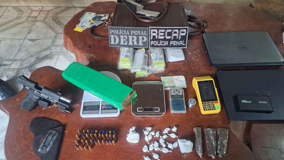 Durante as buscas, também foram apreendidos entorpecentes e materiais comumente utilizados no tráfico de drogas: quatro tabletes de substância análoga à maconha, totalizando aproximadamente 1,068 quilo; 22 buchas de material semelhante à cocaína, com cerca de 78 gramas; três balanças de precisão; dois notebooks; um HD externo; dois aparelhos celulares e uma máquina de cartão.